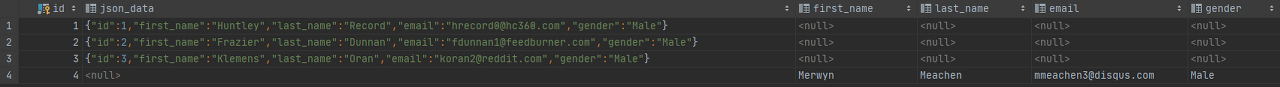 insert into pgsql_json (first_name,last_name, email, gender)